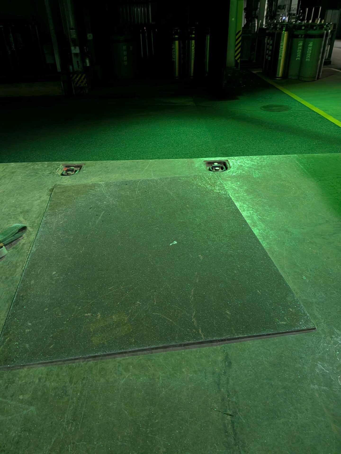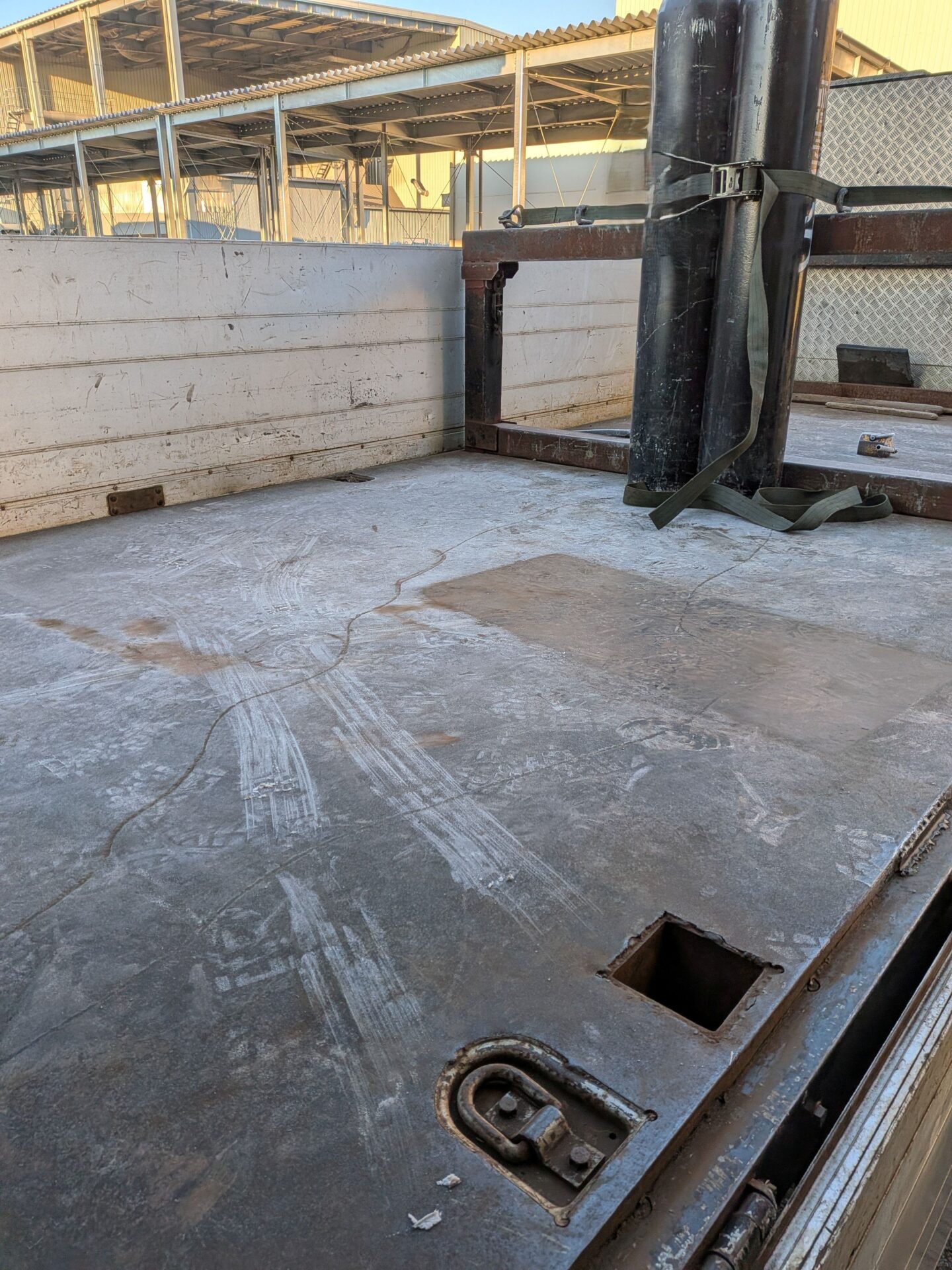 全体的に「白く」なっています。年始くらいから気温が一気に冷え込んでフロントガラスが凍結していたら、大体荷台も凍結していることが多いです。最近では荷台が凍結することはほとんどなくなりましたが、油断しているとたまに凍結してます。これに関しては「平ボディ」で荷台に鉄板を張っている車両ならではだと思います。明るい時間帯なら凍結しているのが分かりますが、暗い時間だと凍結しているのが分かりづらいので荷台に乗る前に一回白くなっているか確認するようにしています。怖いのが自分自身の転倒もそうですが、ガスボンベも「鉄素材」なので積み込み時も滑って転倒させてしまったりもします。